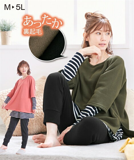 パジャマ マタニティ 大きいサイズ ママ 授乳 服 産前 産後 あったか裏起毛 重ね着風 ルームウエア 上下セット カーキ系/カーマインレッド系 LL/3L ニッセン