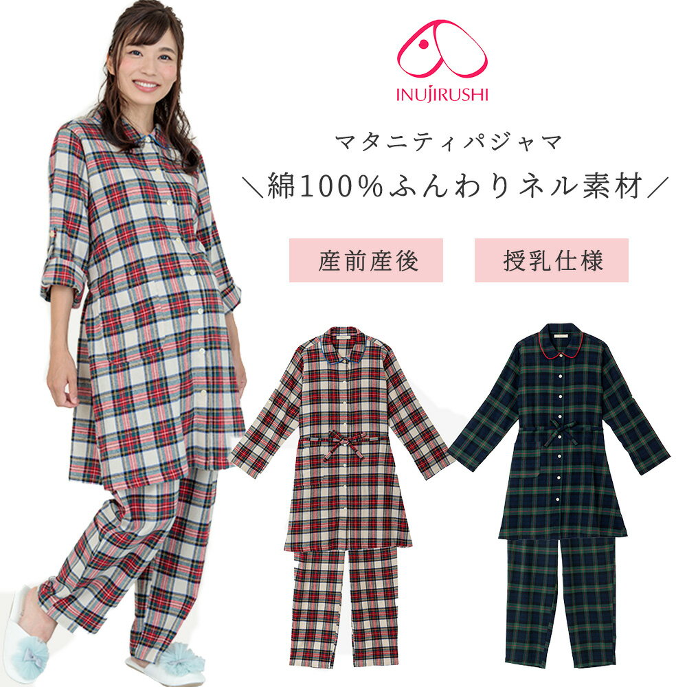 【送料無料】【あす楽】マタニティ パジャマ 綿100% ネル チェック コットン ナイティ ロング丈 授乳に便利 前開き 長袖 授乳服 犬印 Fairy フェアリー マタニティ M L 入院 出産準備 産前 産後 あったか やわらか らくちん ゆったり ルームウェア 秋 冬