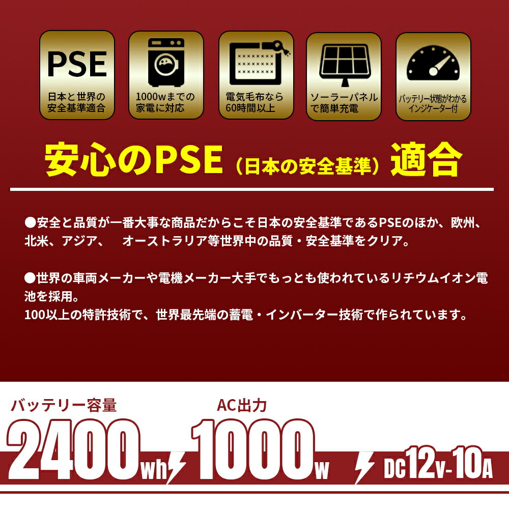 --------------------- ■セット内容 ポータブル電源 ×1 ACアダプター (AC充電ケーブル付き ) ×1 ソーラー充電ケーブル(7909-MC4) ×1 ユーザーマニュアル ×1 サービスカード ×1 合格書 ×1 折り畳みソーラーパネル 100w×2 ■スペック 【ポータブル電源】 バッテリー容量 : 2400Wh ◇出力仕様 ●インバータ出力 連続出力電力 : 1000W 連続出力電圧 : 100-120Vac 定格周波数 : 50/60Hz 力率 : 1 THDV@0.7R (負荷) : <5% 過負荷保護 : 1000W 負荷 < 1200W @ 2分 | 1200W < 負荷 @1 秒; 電力損失 : (無負荷およびターンオフ) <20W 最大効率 : (>70%負荷) 88% ●12V/9A シガーライター出力 連続出力電圧12.2V( ± 1V) 連続出力電流9A( ± 0.3A) ●5V USB 出力 出力電圧範囲 : 5V ± 0,3V 最大出力電流 : 3A ●タイプ C-PD 出力 急速充電PD : プロトコル 出力電圧範囲 : 5-20V (デフォルトで5V) 連続出力電圧/電流 : (5V/9V/12V/15V)3A( ± 0.3A), 20V/2.25A( ± 0.2A) ◇入力仕様 ACアダプタ : 42V/160W PV最大入力電力 : 500W PV入力電圧範囲 : 16-60Vdc PV最大入力電流 : 10A MPPT効率 : 99.5% 最大効率 : >88% ソーラー充電モード : MPPT ◇電池仕様 2400Wh、リチウムイオン バッテリー、4S60P、162162mAh / 14.8V(648648mAh 3.7V に相当) ◇最小単位 IP等級 : IP 21 動作相対湿度 : 10%-90% 動作温度 : 0-40°C 外形寸法 : 494×165×365mm 正味重量 : 22 KG 【ソーラーパネル】 寸法: 650x 500 x 65 mm(折りたたみ時) 重量: 3.9kg. 最大出力: 100 W 最大電圧:18V 最大電流 : 5.56A 開回路電圧 : 21.24V 短絡電流 : 5.96A セル効率 : 20.5% コントローラ : 12V/24V 10A PMW 動作温度範囲 : -20℃〜+65℃ ------------ ●ご購入後「修理・サポート」を受けるためのお願い ※修理やサポート、商品到着直後の返品や交換を受けるために、お送りした梱包の箱は大切に保管いただきますようお願いいたします。
